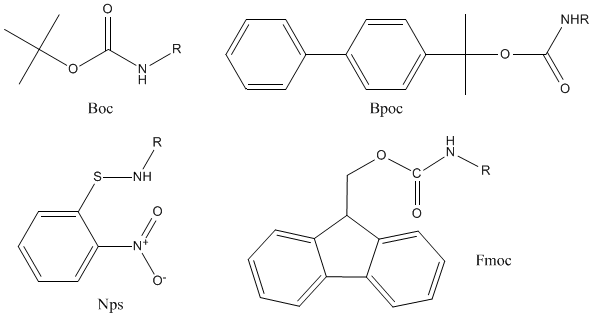 The most important were for instance, tert-butyloxycarbonyl (Boc), O-nitrophenylsulfenyl (Nps) and biphenylylisopropyloxycarbonyl (Bpoc) groups. De-protection by nucleophiles appears to be an attractive alternative to acidolysis in case of Nps group. Cleavage of 9-fluorenylmethyloxycarbonyl (Fmoc) group by secondary amines gained considerable significance in the synthesis of complex peptides.